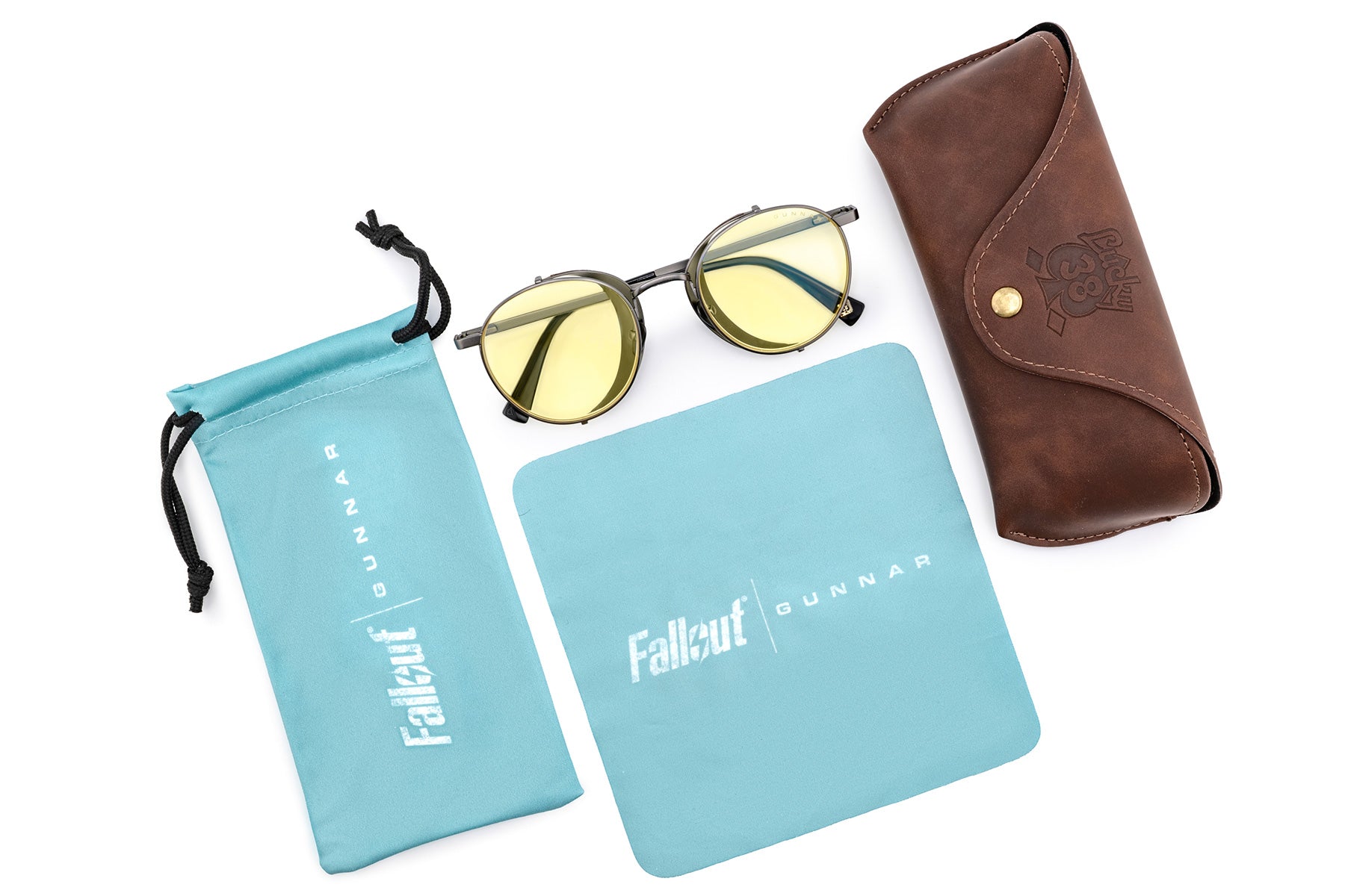 Step into the Mojave’s most iconic high-roller haven with the Fallout Lucky 38 glasses, the official collaboration inspired by the neon glamour and old-world charm of Amazon Studios’ Fallout TV series. These frames channel the vintage decadence and mysterious prestige of the Lucky 38 Casino, whose reputation echoes across the Wastelands. Designed with retro round lenses, silver accents, and premium removable leather side shields, the Lucky 38 brings the spirit of a bygone Vegas back to life equal parts luxury and wasteland grit. Powered by GUNNAR’s patented lens technology, the Lucky 38 glasses reduce digital eye strain, improve visual clarity, and block harmful blue light. Each pair includes exclusive Lucky 38 collectibles: a microfiber pouch, a custom microfiber cloth featuring a retro New Vegas aesthetic, and a premium leather snap case designed to feel like they were plucked straight from the casino’s hidden vaults.