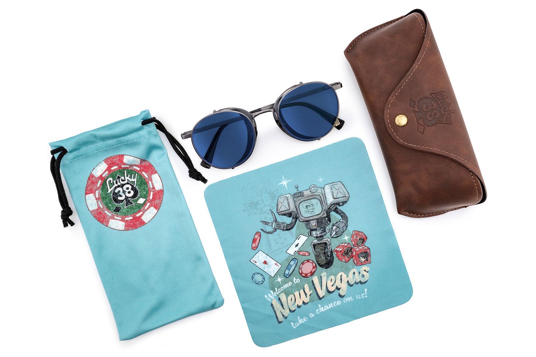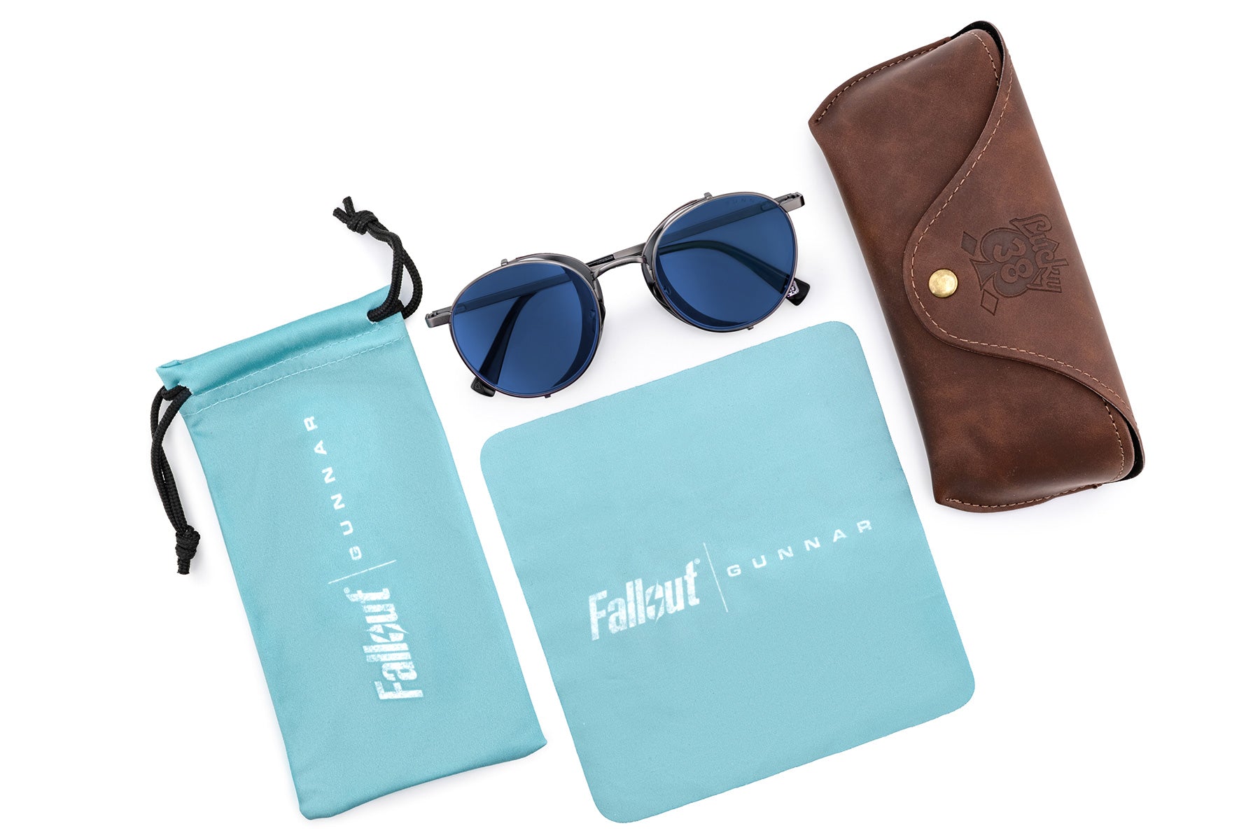 Step into the Mojave’s most iconic high-roller haven with the Fallout Lucky 38 glasses, the official collaboration inspired by the neon glamour and old-world charm of Amazon Studios’ Fallout TV series. These frames channel the vintage decadence and mysterious prestige of the Lucky 38 Casino, whose reputation echoes across the Wastelands. Designed with retro round lenses, silver accents, and premium removable leather side shields, the Lucky 38 brings the spirit of a bygone Vegas back to life equal parts luxury and wasteland grit. Powered by GUNNAR’s patented lens technology, the Lucky 38 glasses reduce digital eye strain, improve visual clarity, and block harmful blue light. Each pair includes exclusive Lucky 38 collectibles: a microfiber pouch, a custom microfiber cloth featuring a retro New Vegas aesthetic, and a premium leather snap case designed to feel like they were plucked straight from the casino’s hidden vaults.