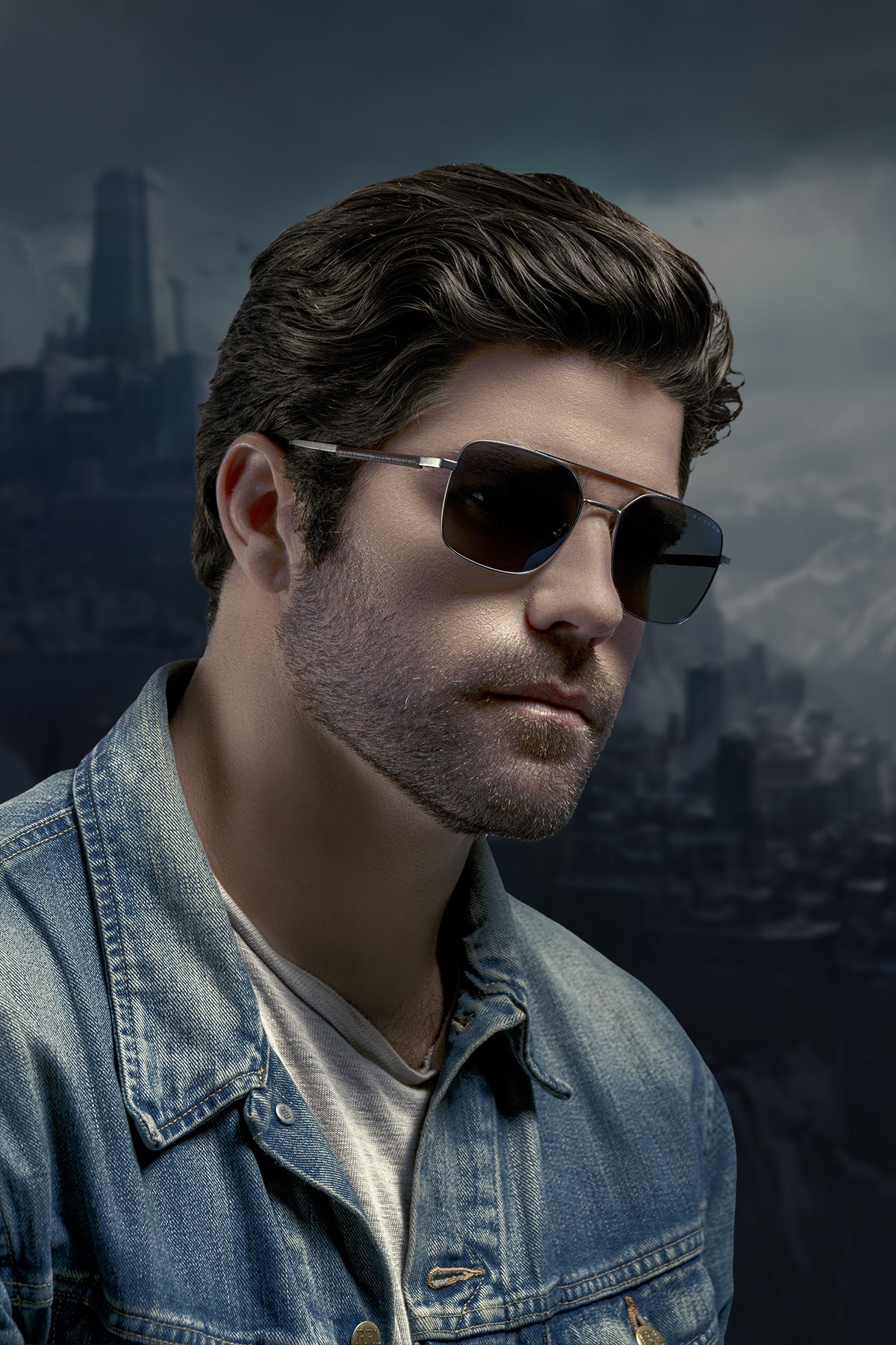 • Brushed nickel bold aviator style in stainless steel and wrapped leather frame material